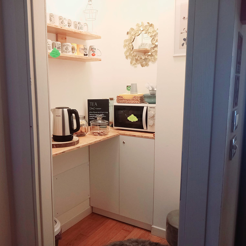 Adiacente alle camere, avrai a disposizione una saletta dove potrai prepararti un thè con biscotti/torta per rilassarti e goderti un momento di relax.
